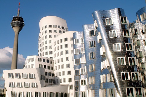 Το 1989 άρχισαν οι εργασίες για να μετατραπεί το πρώην βιομηχανικό λιμάνι στο «Media Harbor», ένα ζωντανό χώρο με σύγχρονα κτίρια γραφείων, καταστημάτων, εστιατορίων και διαμερισμάτων. Τα κοσμήματα του λιμανιού είναι τα τρία δημιουργήματα του Frank Gehry, τα οποία «στέκονται» το ένα δίπλα στο άλλο… Ένα λαμπρό ασημί κτίριο με μια κυματιστή πρόσοψη βρίσκεται ανάμεσα στα δύο ψηλότερα κτίρια – πύργοι με πολυεπίπεδη κλίση.